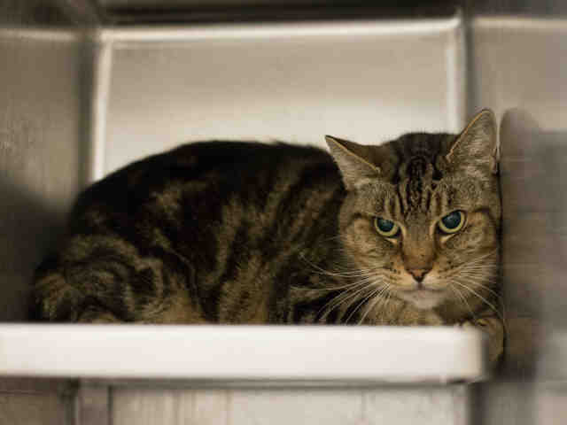My name is Carmela and I am described as a spayed female, brown tabby Domestic Shorthair.