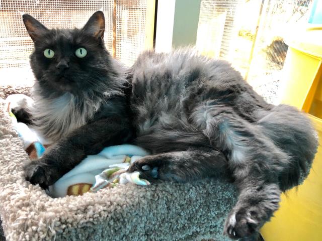 Staff named me Stars and I am a spayed female, black smoke Domestic Longhair.