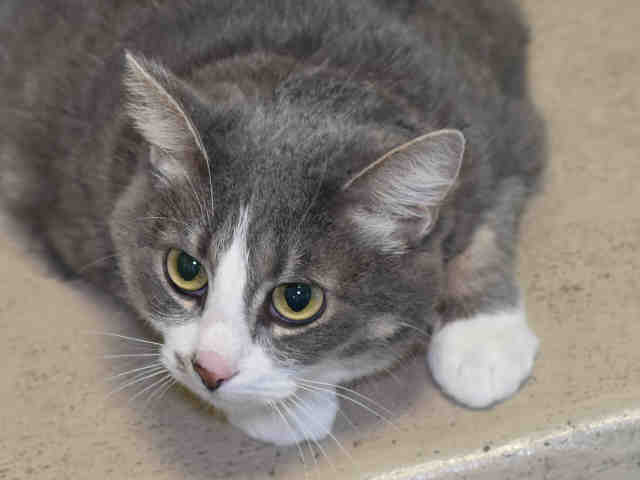 I am a spayed female, tabby-gray and white Domestic Shorthair.