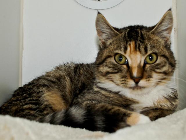 Staff named me Story* and I am a spayed female, brown tiger and tortie Domestic Shorthair.